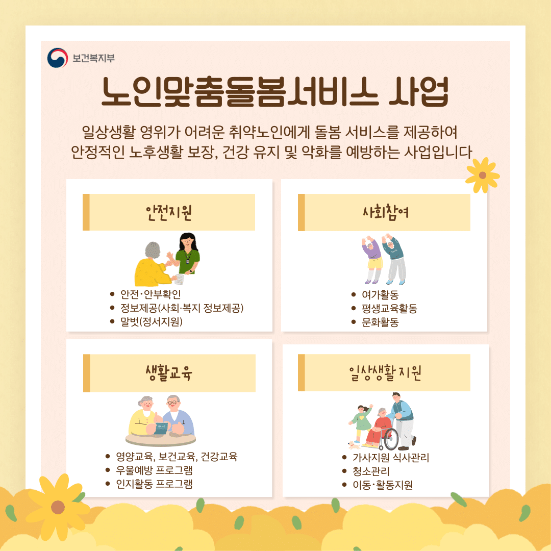 노인맞춤 돌봄 서비스는 다음과 같은 다양한 영역으로 나뉘어 제공됩니다: